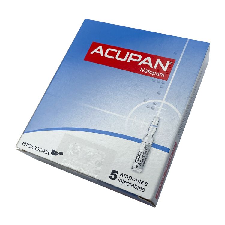 Препарат поставляется в картонной коробке с четкими маркировками и логотипом производителя Biocodex. На лицевой стороне упаковки указано название препарата, активное вещество (нефопам), форма выпуска (раствор для инъекций), и количество ампул (5 шт). Каждая ампула содержит 2 мл раствора, на ней также указано название препарата, дозировка и объем. Упаковка выполнена в светло-голубых тонах с красным названием «ACUPAN».