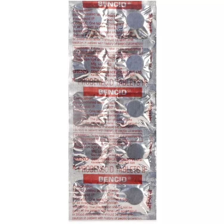 Таблетки Бенемид производства Geno Pharmaceuticals Ltd (Индия) применяются для лечения подагры. Они нормализуют содержание в крови мочевой кислоты, в результате чего ее кристаллы перестают образовываться и откладываться в суставах в виде специфических узелков (тофусов). Препарат можно использовать также при приеме пенициллинов, цефалоспортинов (исключение – цефалоридин). Основное действующее вещество Пробенецид усиливает обратное всасывание мочевой кислоты в почечных канальцах. Происходит усиленное ее выведение из организма, в результате чего фиксируется урикозурический эффект – снижение концентрации мочевой кислоты в крови. Это предотвращает отложение уратов в почках и хрящах. Под действием препарата мочевая кислота из уже существующих тофусов может высвободиться в кровь, что может спровоцировать острый подагрический приступ. Максимальная концентрация в крови достигается спустя 3 часа после приема препарата. Выводится с мочой.