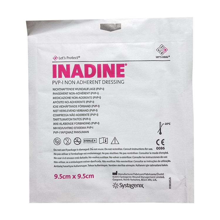 Инадин - это вязаная контактная повязка с низкой адгезией, пропитанная 10% растворимым йодофорним гелем (йод повидон), который наносится непосредственно на рану.