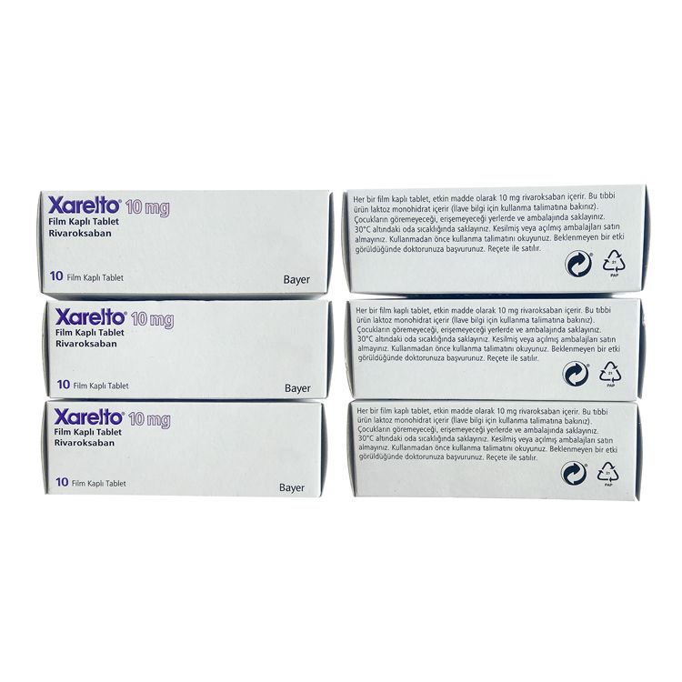 Препарат поставляется картонных коробках белого цвета с фиолетовыми элементами и логотипом компании Bayer. На упаковке указано название препарата, дозировка, форма выпуска, а также активное вещество — ривароксабан. Внутри упаковки содержатся блистеры с 10 таблетками, а также инструкция по применению.