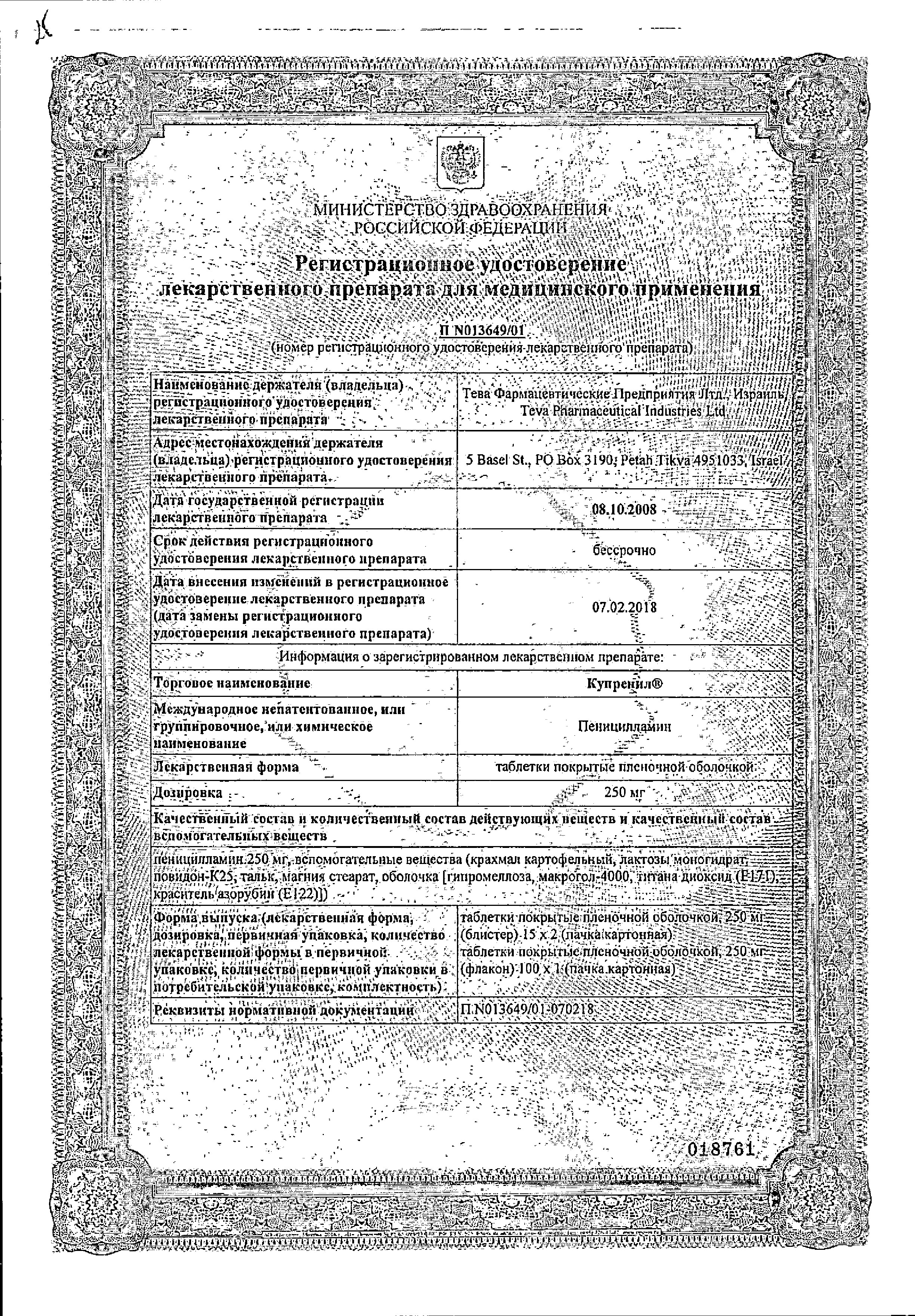 Соединения с металлами в дальнейшем выводятся из организма с мочой. Излишки препарата, не вступившие в реакцию с металлами, инактивируются в печени. Купренил не назначают одновременно с препаратами, содержащими соединения металлов, – это сильно снизит их эффективность.
