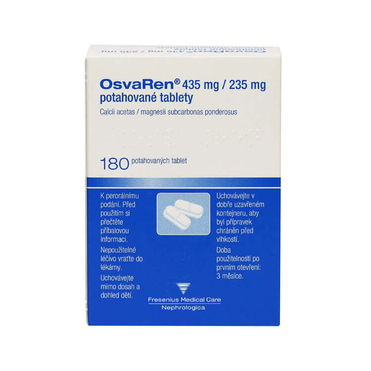 Таблетки Осварен предназначены для лечения гиперфосфатемии у пациентов, которые страдают от хронической почечной недостаточности и вынуждены проходить процедуры перитонеального диализа и гемодиализа. Основные действующие компоненты препарата – магния карбонат и Кальция ацетат. Эти вещества связывают поступающие с пищей фосфаты, в результате чего они выводятся из организма не через почки с мочой, а через кишечник с каловыми массами. Магния карбонат способствует активизации протекающих в организме обменных процессов и нормализации ионного баланса во всех видах мышц. Он действует как спазмолитик, антиагрегантный и антиаритмический препарат. Кальция ацетат регулирует кальций-фосфорный обмен, абсорбирует содержащийся в ЖКТ фосфор, приводит к восстановлению баланса кальция и снижению уровня фосфатов в сыворотке крови.