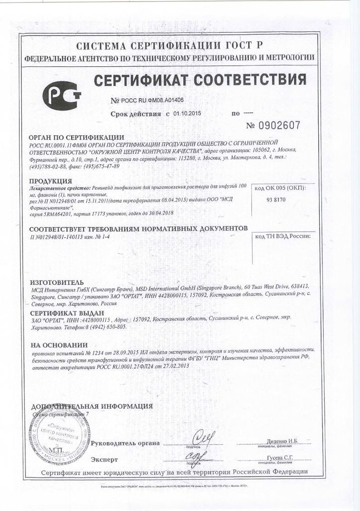 Ремикейд выпускается во флаконе, содержащем порошок для приготовления концентрата раствора для инфузий. Порошок состоит из лиофилизированных белых шариков.